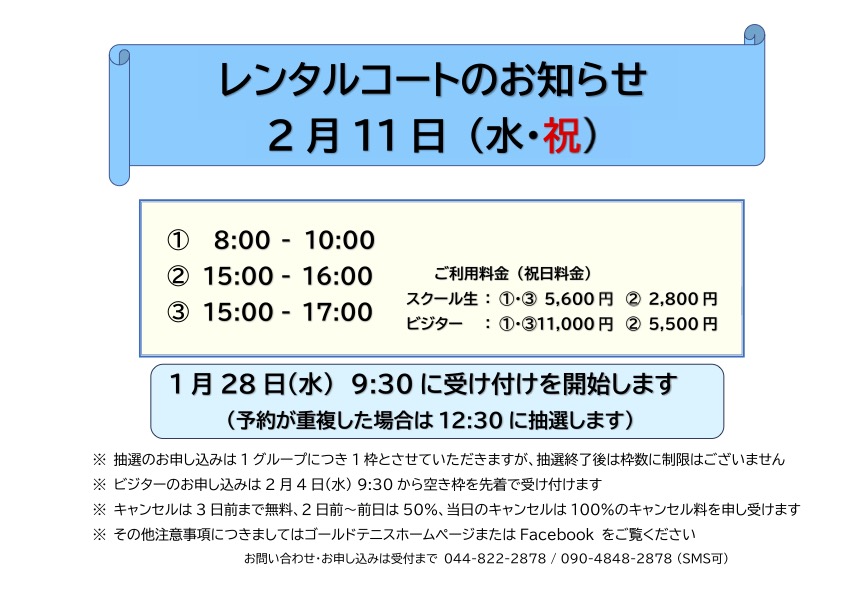 ※11月8日から当面の間、土曜日7:00~8:30のレンタルコートは休業します