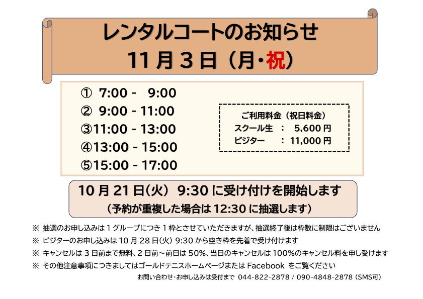 【11月3日(月・祝)のレンタルコートのお知らせ】